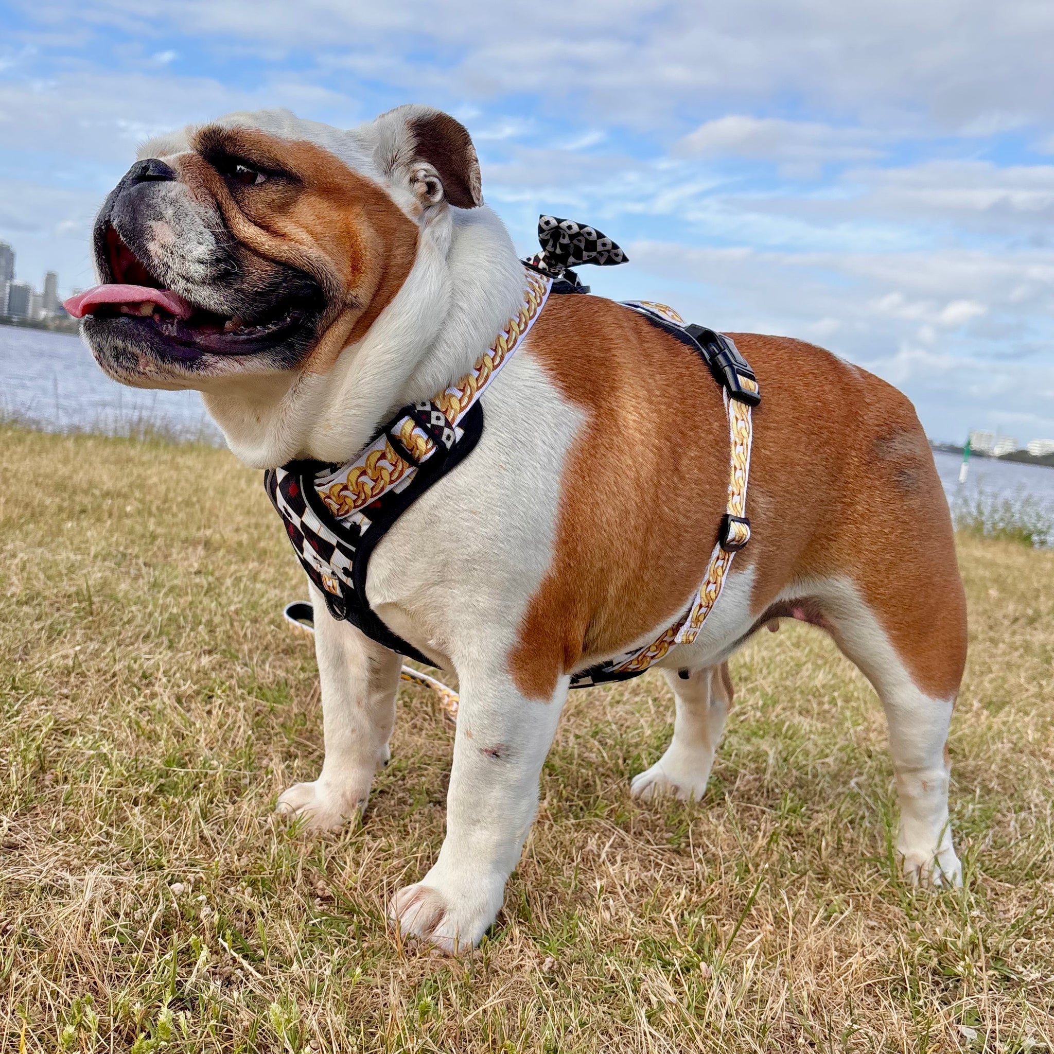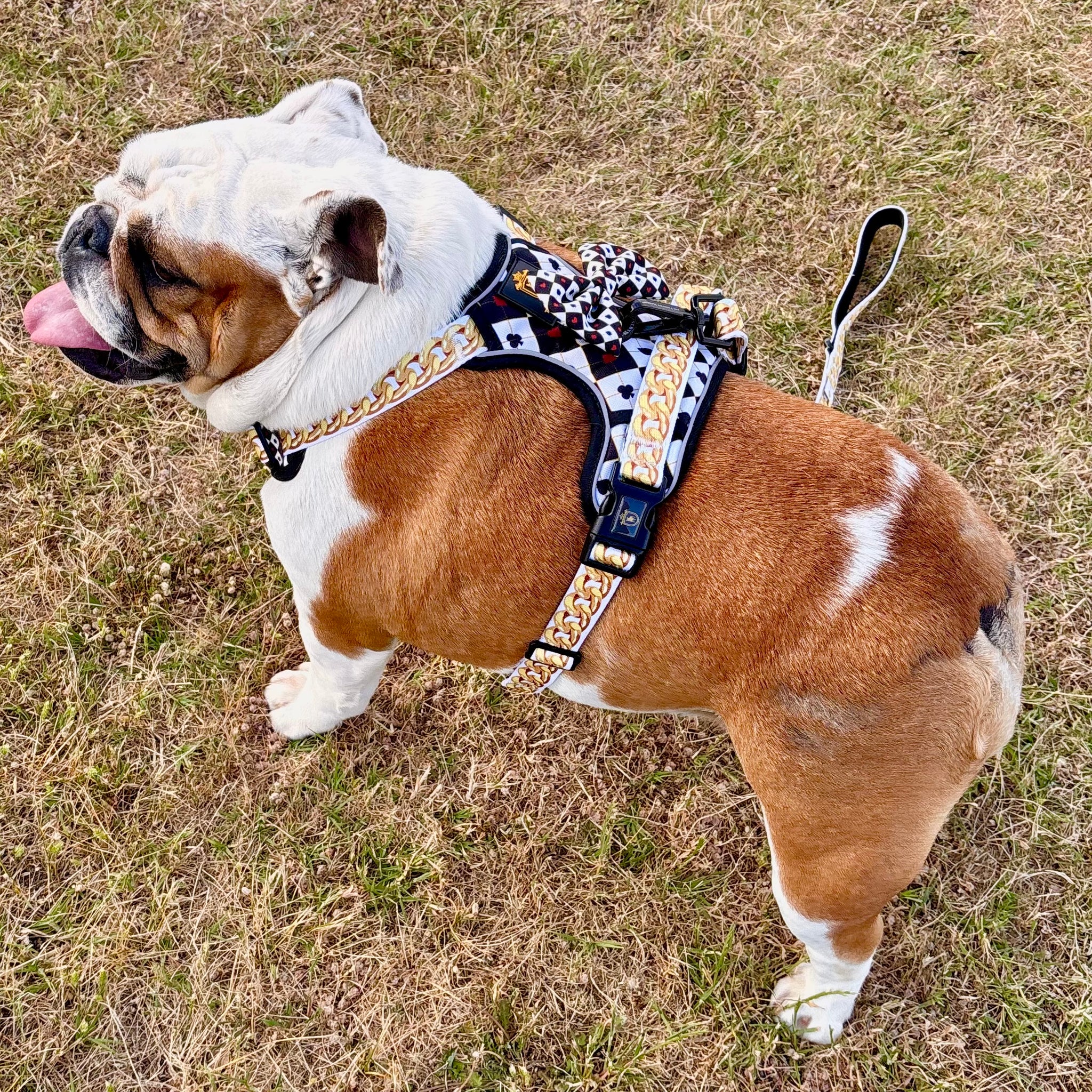 The most fashionable Designer no pull dog harness which is fully adjustable.
