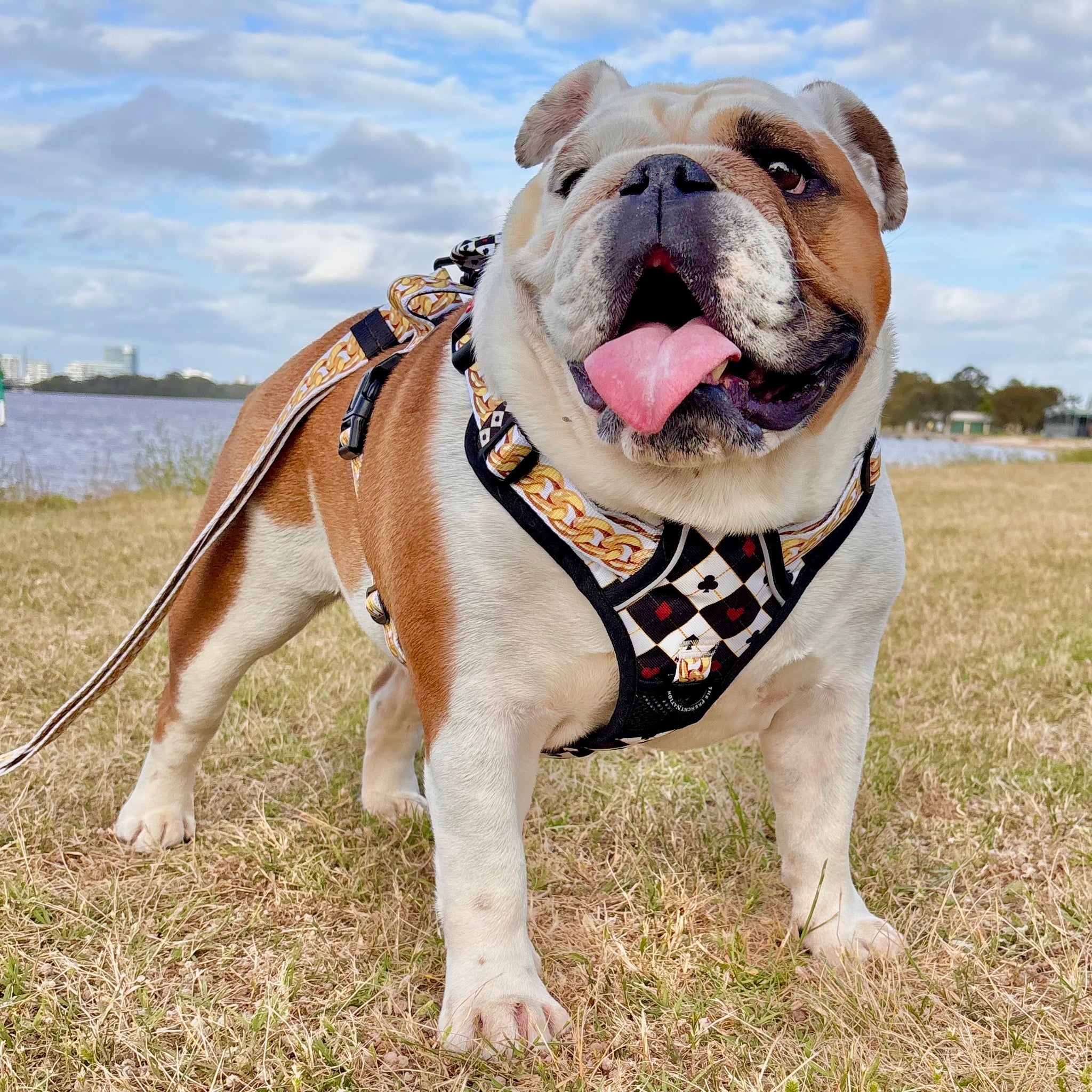 WIGGLEBUTT-FRIENDLY STRAPS adjusts perfectly to accommodate those wide Bulldog chests and wiggly Bulldog butts!